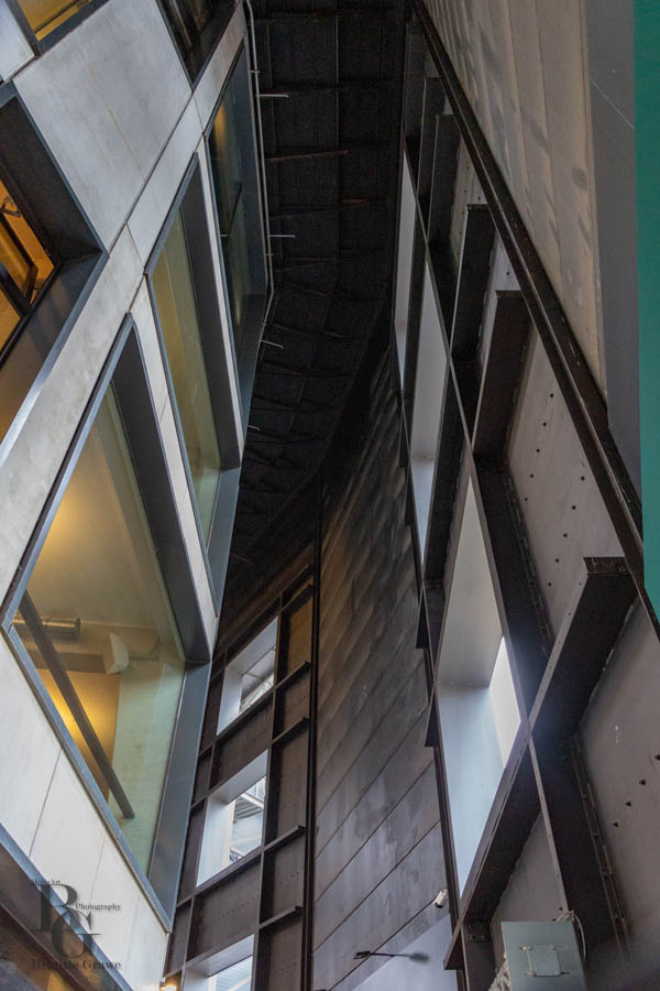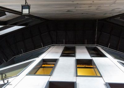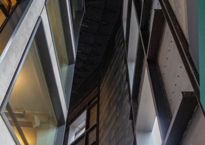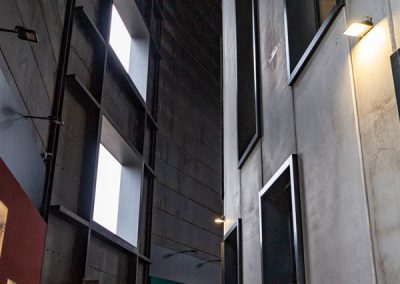 Die äußere, denkmalgeschützte Hülle blieb unangetastet. Stattdessen entstand im Inneren des ehemaligen Scheibengasbehälters ein neuer, moderner 5stöckiger Betonbau. Keine leicht zu lösende Raumsituation …