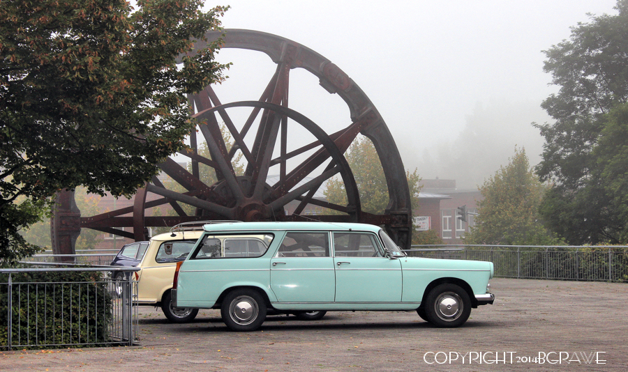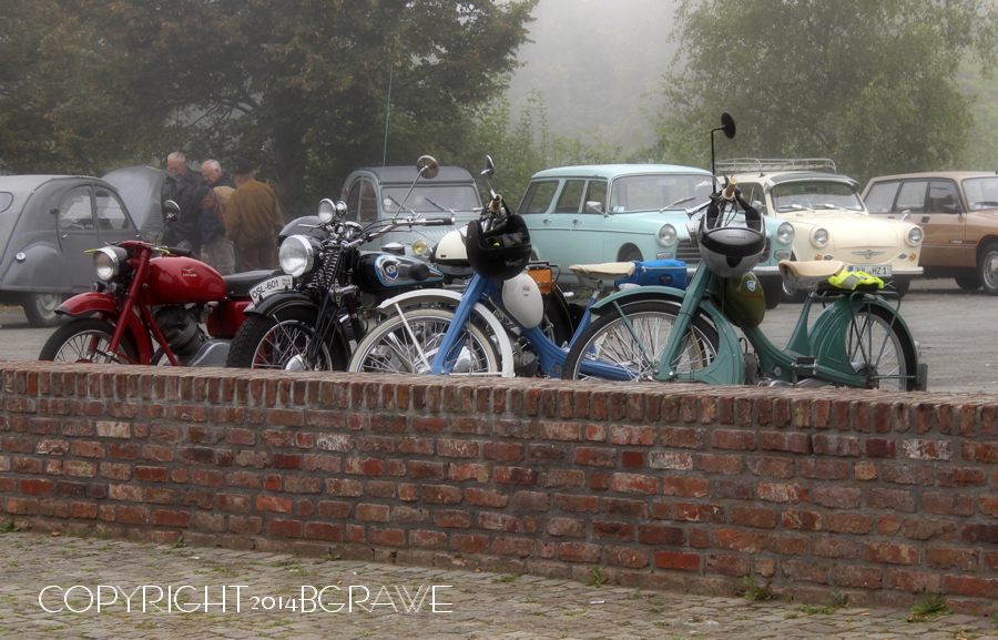 So packte ich Sonntagmorgen meine Kamera ein, und machte mich humpelnder Weise auf den Weg. Der Zinkhütter Hof ist glücklicherweise nicht weit vom neuen Zuhause entfernt. Es war noch früh, als ich ankam und das Wetter nicht gerade toll. Die noch frische, feuchte Luft hing in Nebelschwaden über Landschaft und Gelände. Die Teilnehmer des Oldtimertreffens störte dies nicht. Die Ersten waren bereits eingetroffen.